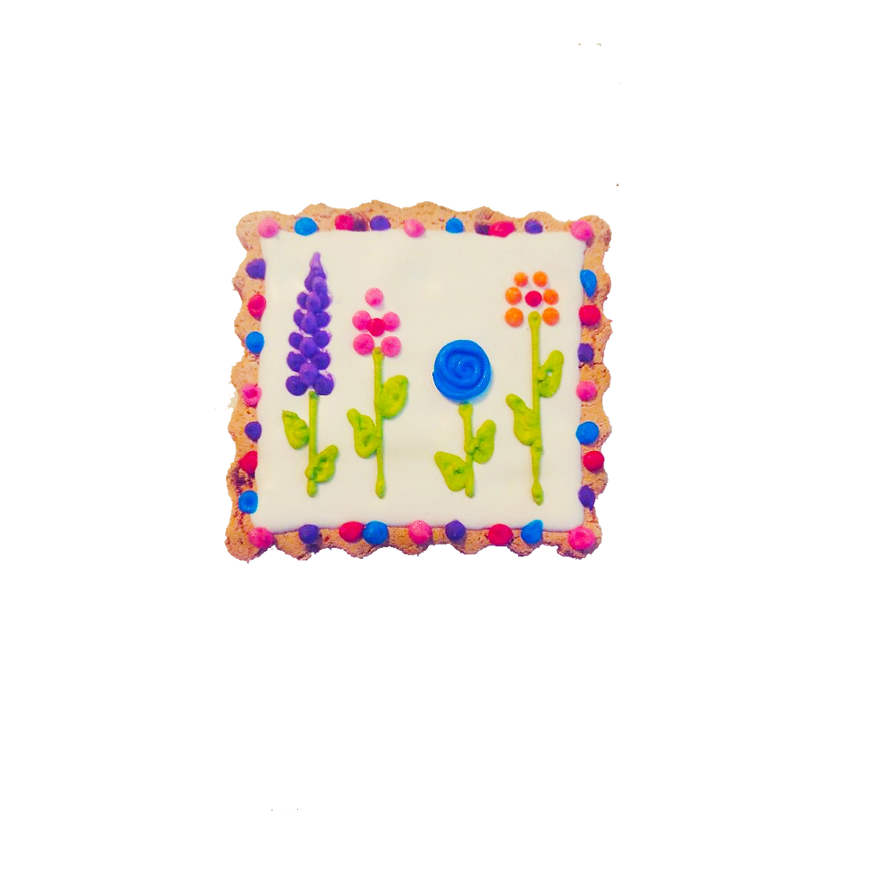 All decorated dog cookies are made using Royal Icing (powder sugar, egg whites, water, and color gel).